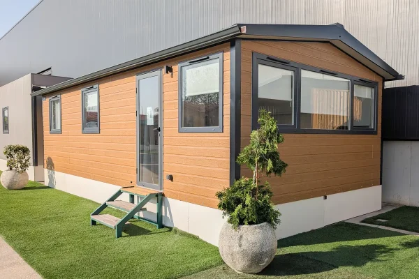 Mobil home nuevo en exposición NIDIFY. Acabado exterior Canexel Yellowstone y carpintería exterior de PVC tipo climalit antracita. Acabado interior colección Vintage.
