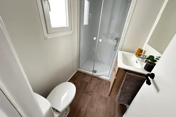 Mobil home nueva en exposición NIDIFY con acabado exterior Canexel Gris y carpintería exterior de PVC blanca. Acabado interior nature con tejado a 2 aguas.