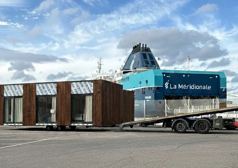 Uno de los elementos clave de este proyecto ha sido la gestión integral de la logística. El transporte marítimo de mobil homes para campings insulares requiere una coordinación precisa entre fábrica, puerto, naviera y equipos de montaje en destino.