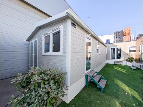 Mobil home nuevo en exposición NIDIFY. Acabado exterior Canexel Gris y carpintería exterior de PVC tipo climalit blanca. Interior colección Vintage.